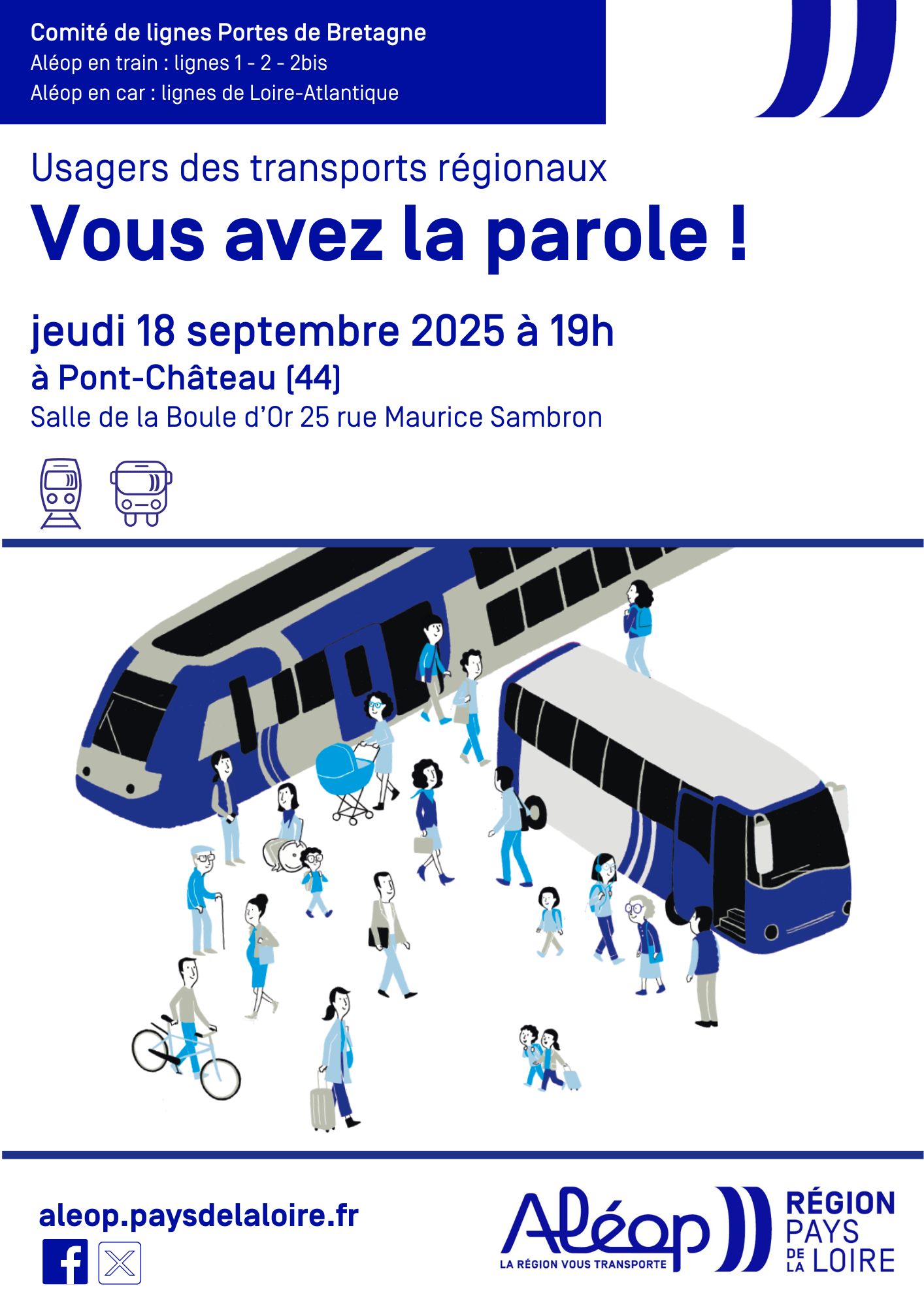 Jeudi 18 septembre 2025, à 19h, une réunion publique d’information est organisée pour les usagers des transports régionaux, à Pont-Château.