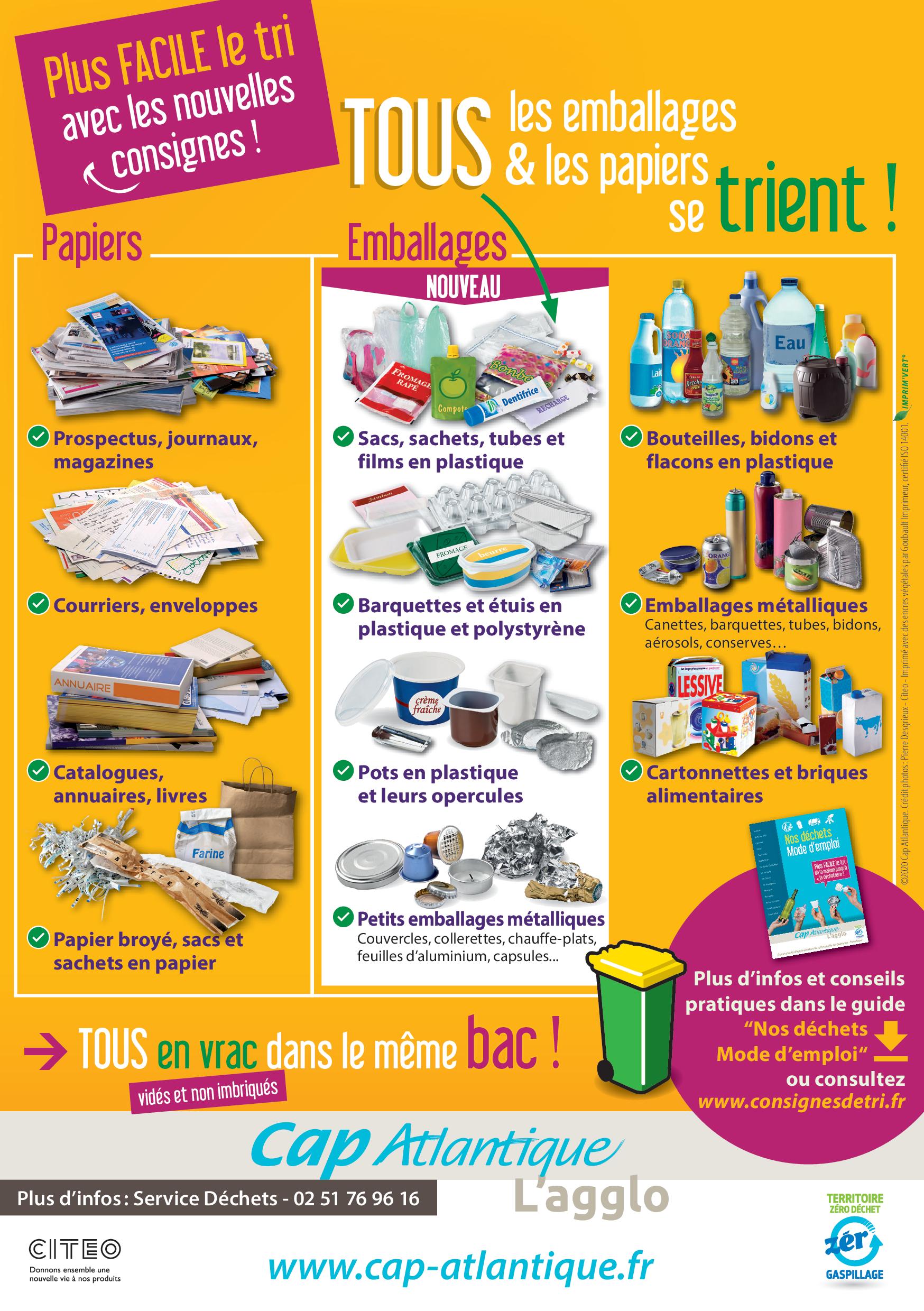 Les emballages et les papiers sont des déchets recyclables. Pour être correctement recyclés, ils doivent être déposés en vrac dans le bac jaune ou dans l’un des conteneurs en apport volontaire.