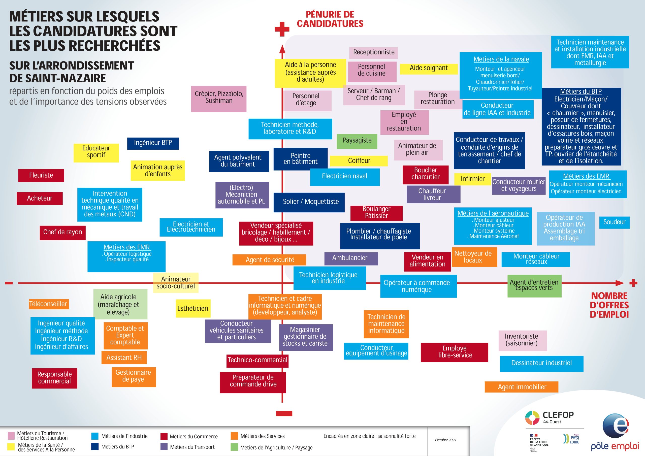 Cette carte ici présente les métiers sur lesquels les candidatures sont les plus recherchées à l’échelle d’un territoire couvrant 6 communautés de communes/d’agglomérations (CapAtlantique La Baule-Guérande Agglo, Saint-Nazaire Agglo, Pontchâteau St-Gildas des Bois, Estuaire et Sillon, Sud Estuaire et Pornic agglo). Tous les métiers qui y figurent recrutent. Cette carte date de fin 2021 mais elle reste d’actualité aujourd’hui.